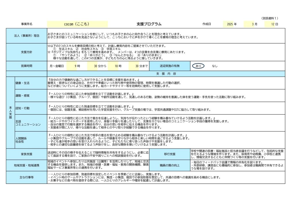 支援内容の公開 2025.05.072025.11.23 支援プログラムの公表 公式LINEはこちら cocomとは instagram ごあいさつ ご利用までの流れ 支援内容 支援内容の公開 施設紹介